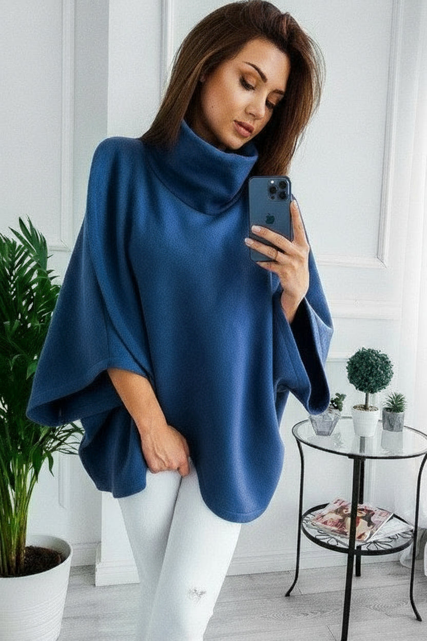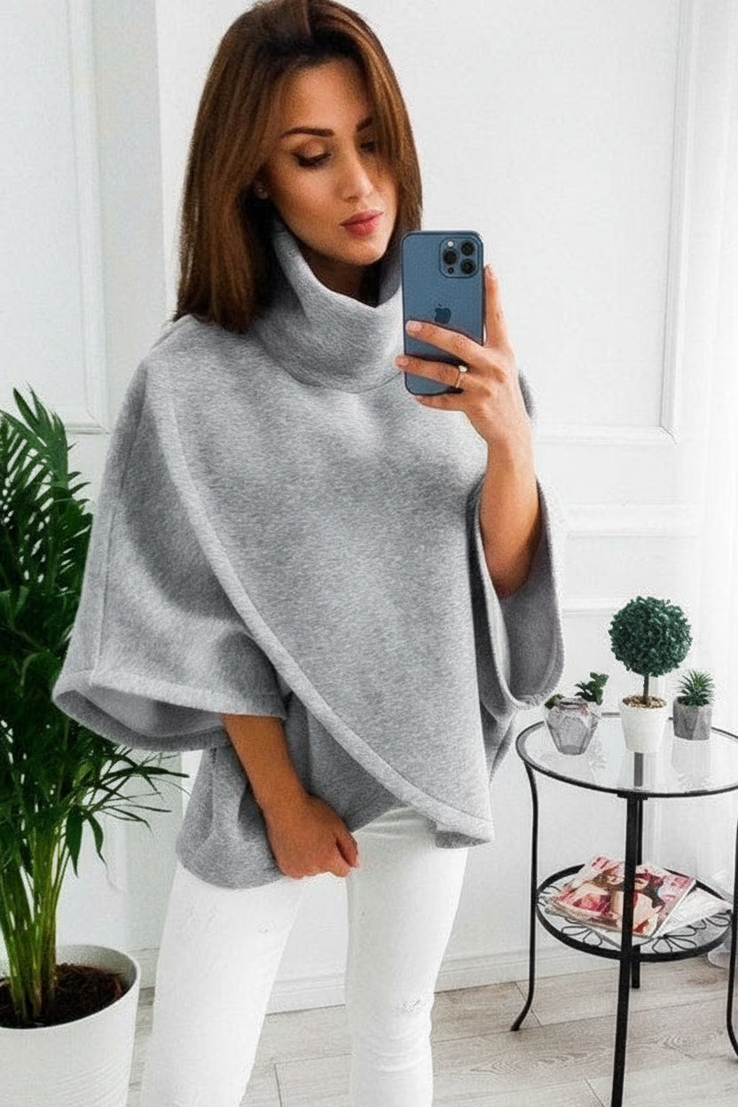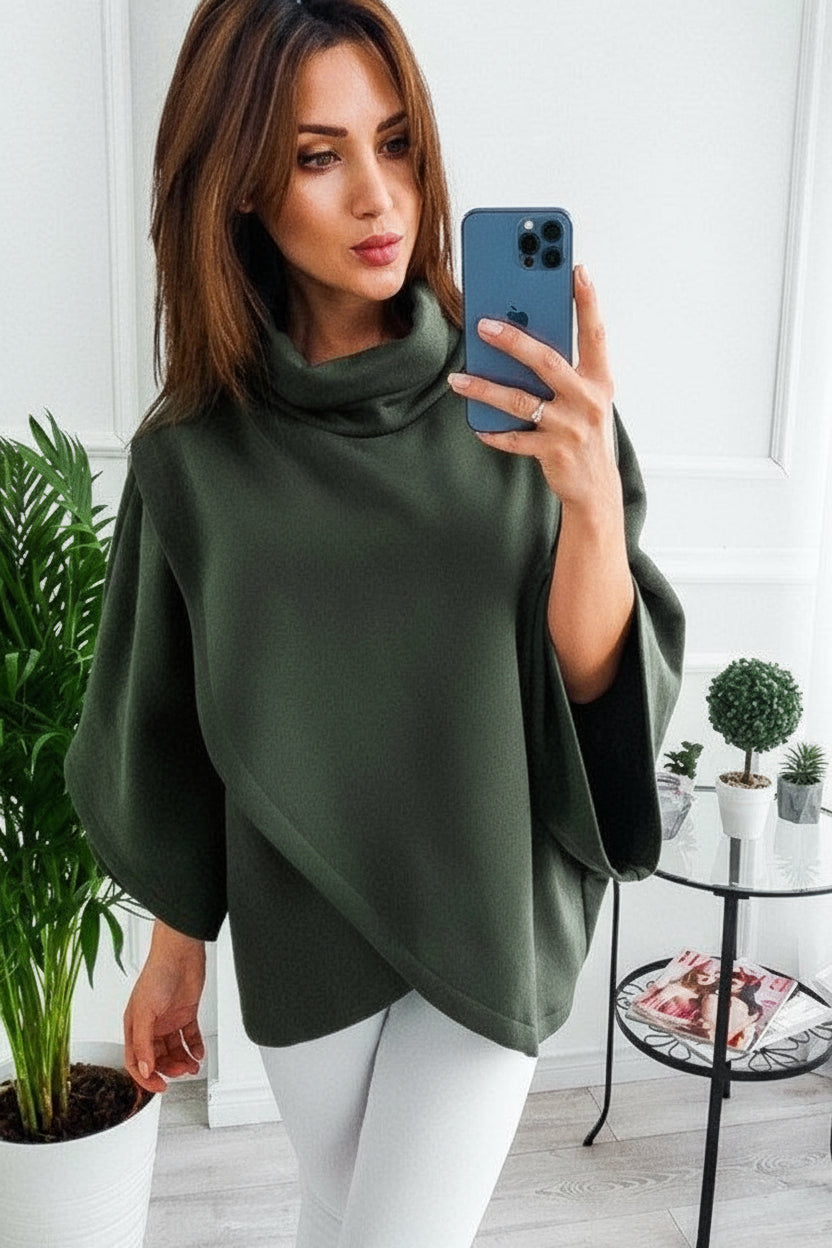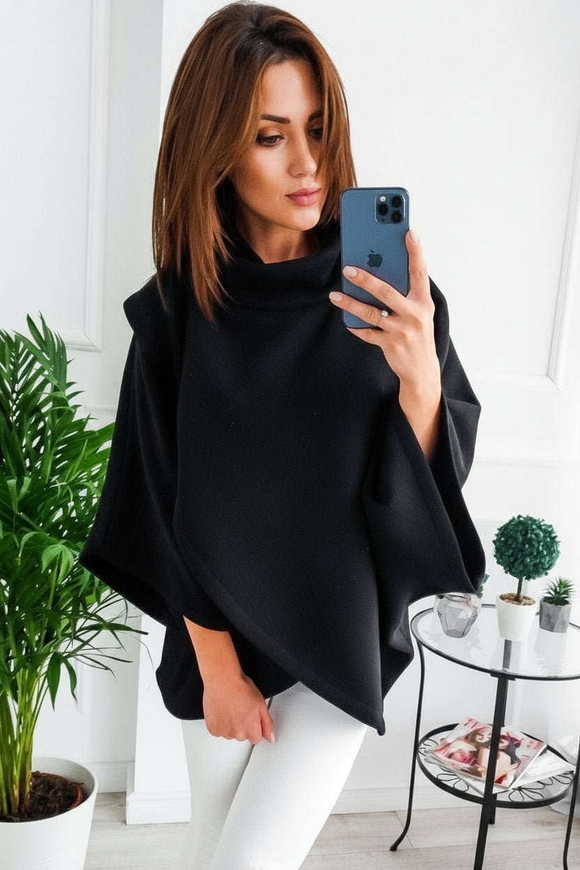« Veste longue style chauve-souris en faux deux-pièces, manches longues, fermeture trois boutons. Velours épais avec surpiqûres tendance, pour un look chic et confortable. »